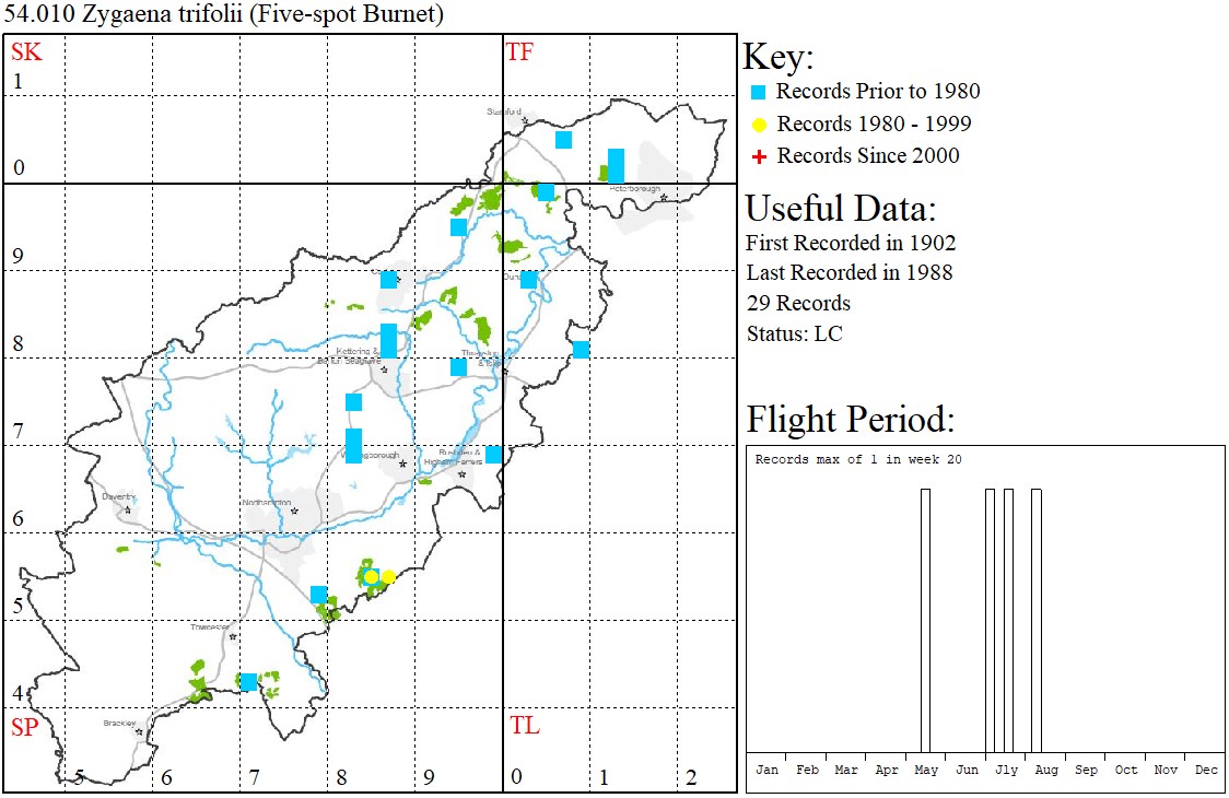 B&F: 0170 ABH: 54.010 Status: Extinct resident. Distribution and Abundance: Formerly local. Primary Habitat: Grassland. Flight Period: June and July. Localities: Salcey Forest, Wakerley Wood, Bedford Purlieus and Barnack Hills and Holes. Observations: It is stated in M.O.B.G.B.I., Vol. 2, page 111, that the Five-spot Burnet appears to have become extinct in the southeast counties during the last two decades or so. This was written in the early 1980s (Tremewan, 1980a; 1982a). Looking at the historical records that I hold, as the species was only ever local and at the limit of its range in Northamptonshire, I have taken it that all post 1960 records refer to the Narrow-bordered Five-spot Burnet Z. lonicerae as it seems that there is a strong possibility that this is the case. Confusion Species: Narrow-bordered Five-spot Burnet L.O.N.: July 1905 Barnwell Wold, Yardley Chase. Locally plentiful. First Record: 1902, V.C.H. |