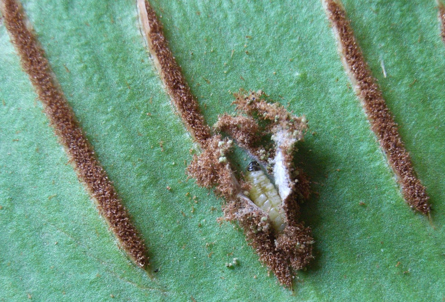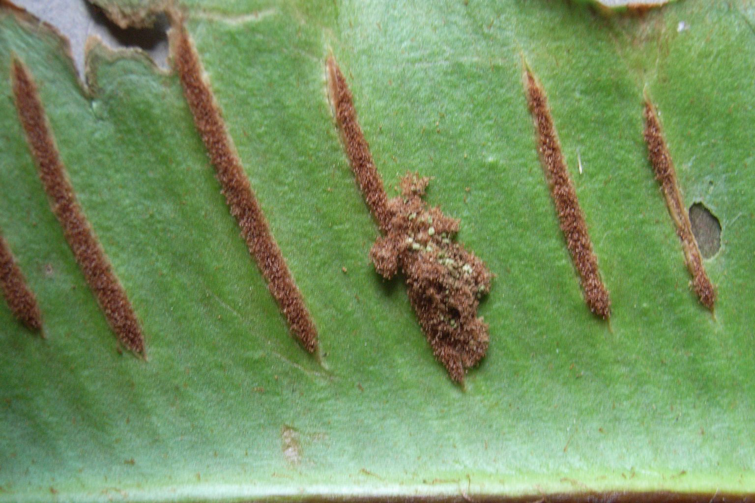 mines mature fern fronds, usually Hartstongue Fern, and makes a case