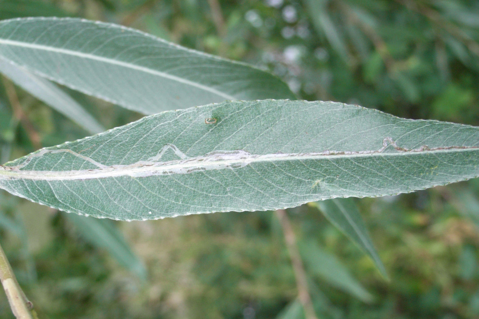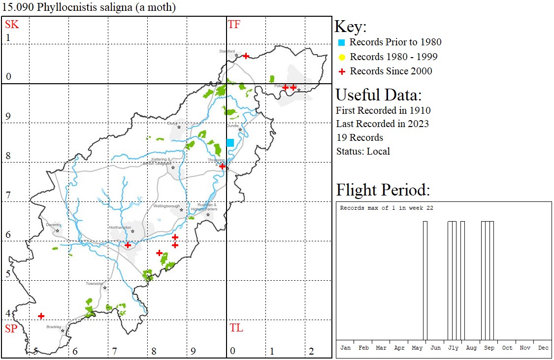larvae mine the leaves of Willows. NB: A similar species, Phyllocnistis ramulicola, was discovered in 2006 as new to science in Havant Thicket, Hampshire and may be present in VC32. Adult moths can only be separated by dissection of the genitalia.