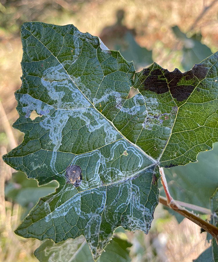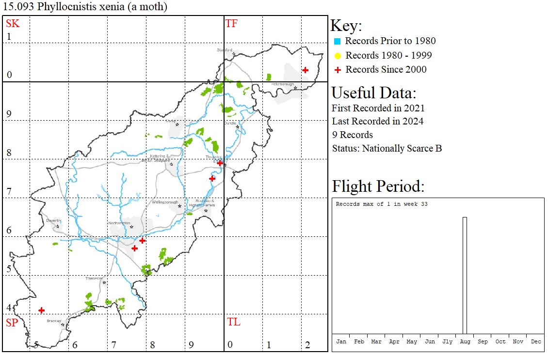 Observations: The silvery mines may be found on the upper surface of Grey Poplar (Populus canescens), and occasionally White Poplar (Populus alba), apparently favouring saplings or sucker growth. The larva then folds the leaf edge over and pupates in a cocoon in the fold. The species has expanded its range throughout south-east England and has been found in Suffolk, Norfolk, Cambridge and Hampshire.