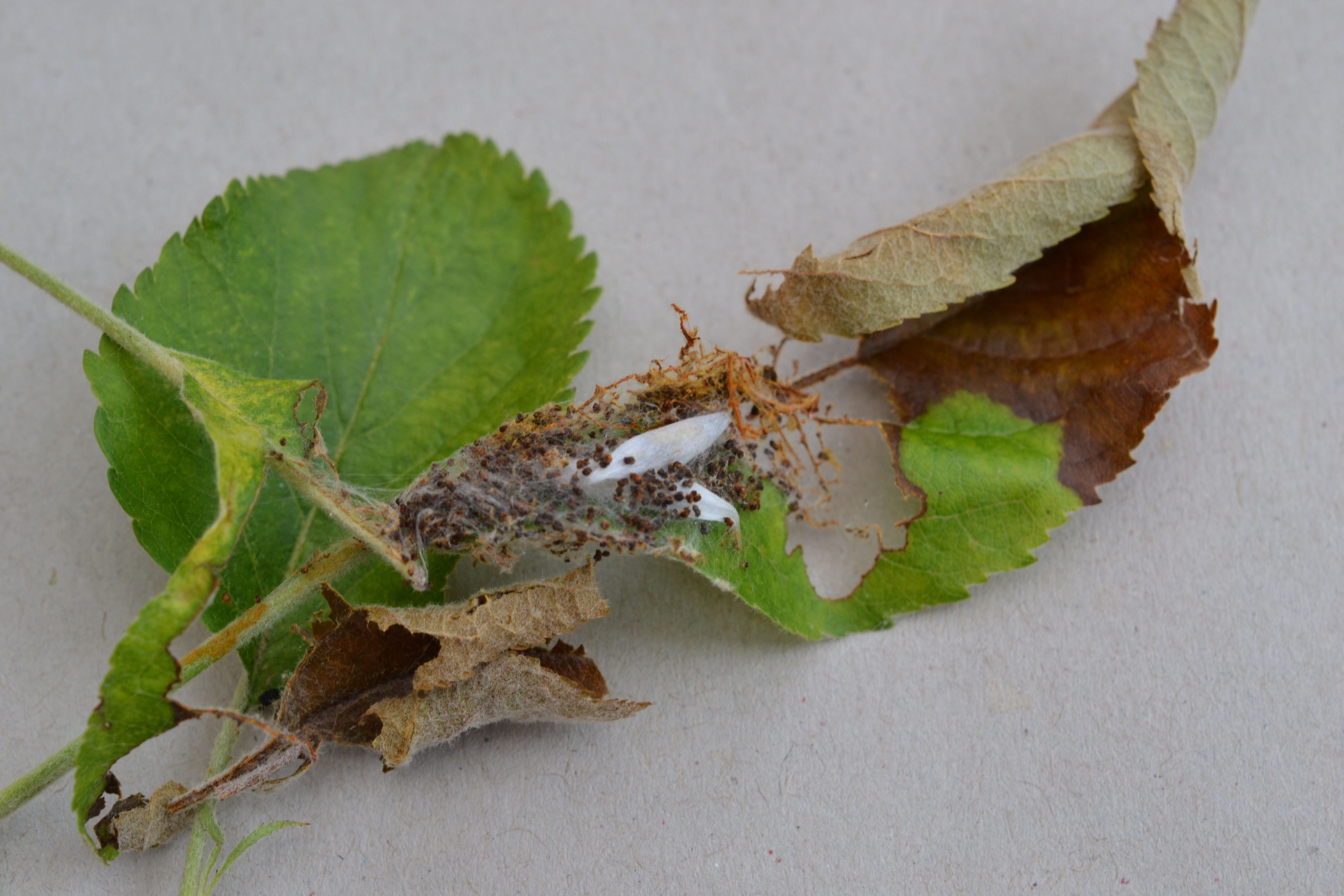 mine the leaves of Apple, then feed gregariously in a silk web. Adults