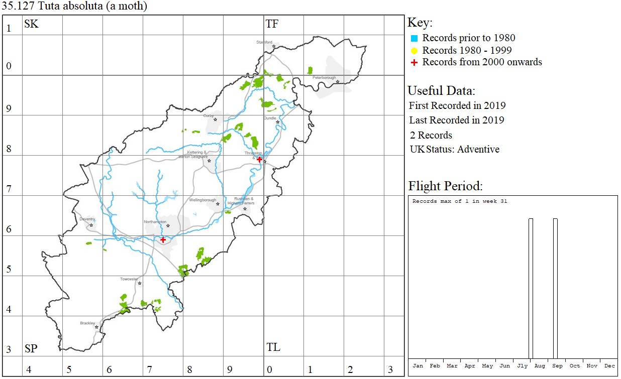 mine the leaves of tomato plants, forming quite an obvious pale blotch. However, larvae can also be found within the stalks and fruits themselves. Adults will attend light traps but must be subject to dissection to confirm identification, but further records may be best gleaned from inspection of tomato plants in your care.