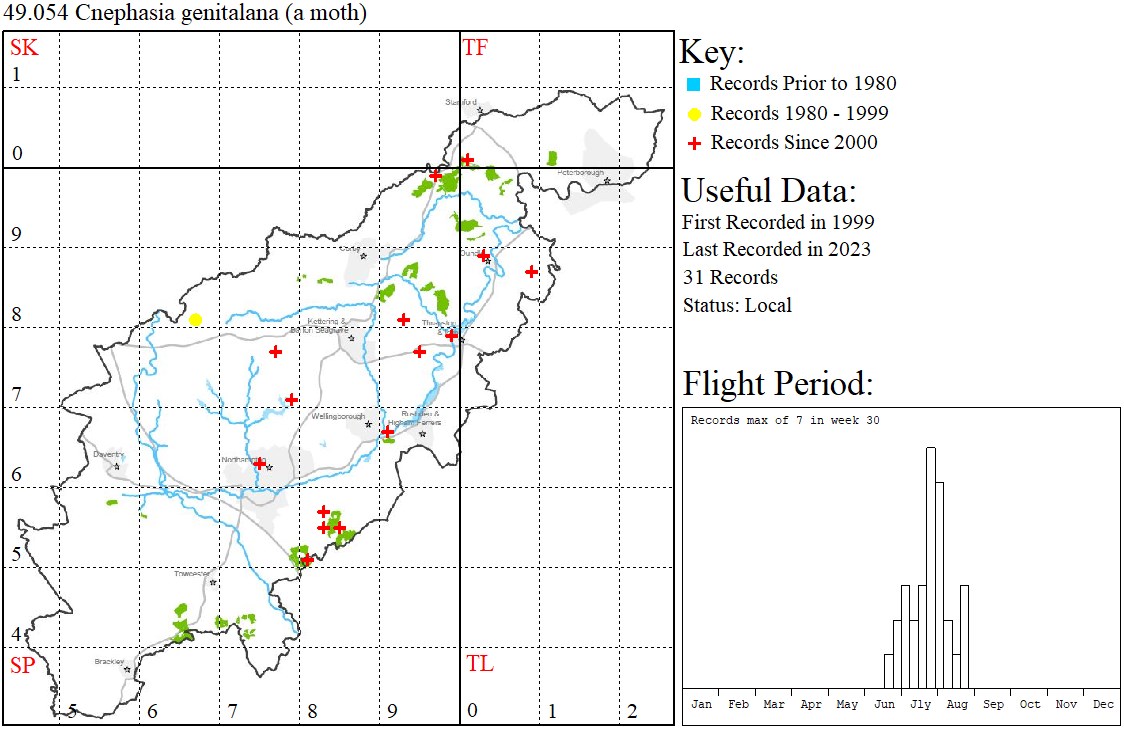 Observations: Very likely under-recorded in VC32. Demonstrated by genitalia dissection of samples of Cnephasia species in one Thrapston garden (2018-2019) this was one of the most frequent Cnephasia visitors to the light traps. Larvae
