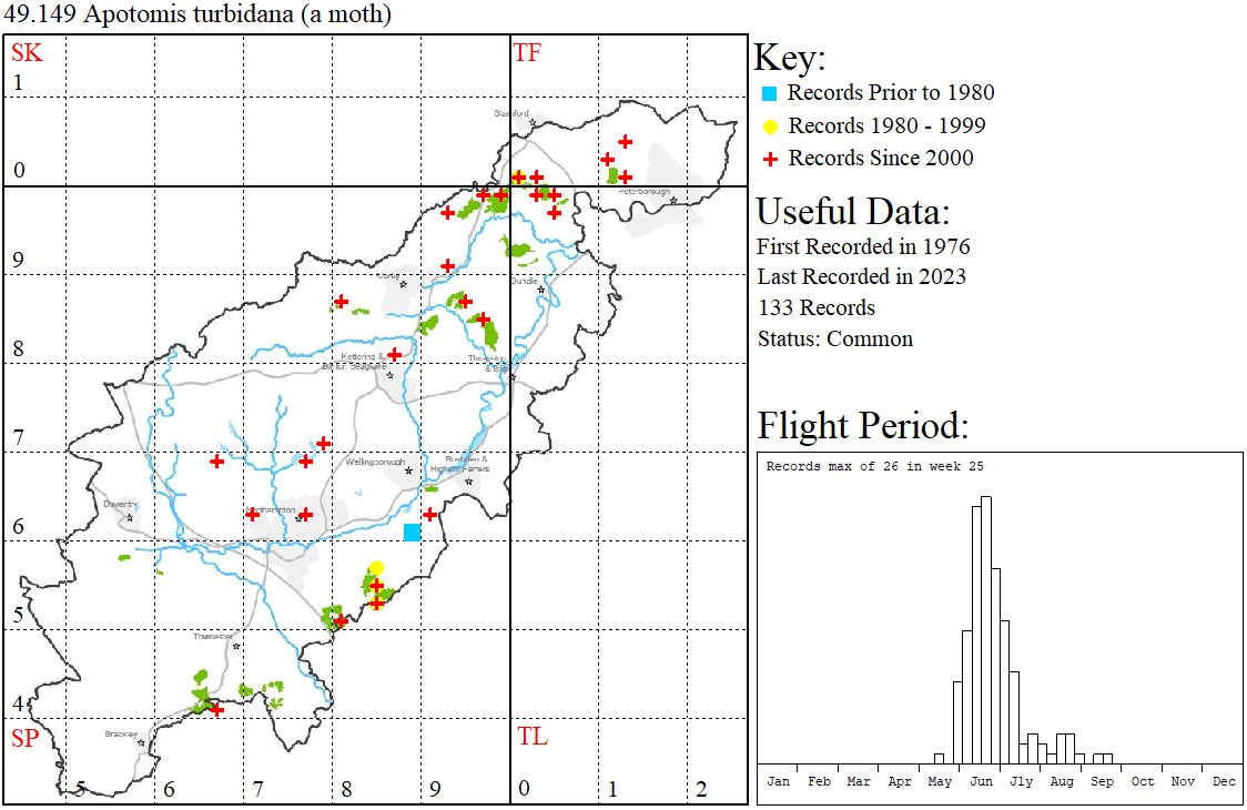 ABH: 49.149 Status: Resident Distribution/Abundance: Common Primary Habitat: Woodland Wingspan: 20mm Flight Period: June - July Observations: Larvae feed on Birch. Confusion Species: Other bird dropping mimics. See: Bird Dropping Mimics for an quick guide L.O.N.: N/A First Record: 1976, Crawford. |