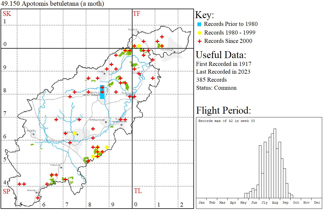 ABH: 49.150 Status: Resident Distribution/Abundance: Common Primary Habitat: Woodland Wingspan: 16-20mm Flight Period: June - September Observations: Larvae feed on Birch. Confusion Species: Other bird dropping mimics. See: Bird Dropping Mimics for an quick guide L.O.N.: N/A First Record: 1917, KDNHS. |