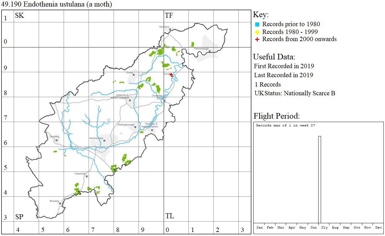 Observations: The larva feeds on Bugle, initially in the rootstock, and after hibernation, in the stalks of leaves. Adult moths are active in the afternoon sunshine, but will attend light traps. Adults must be dissected to confirm ID.