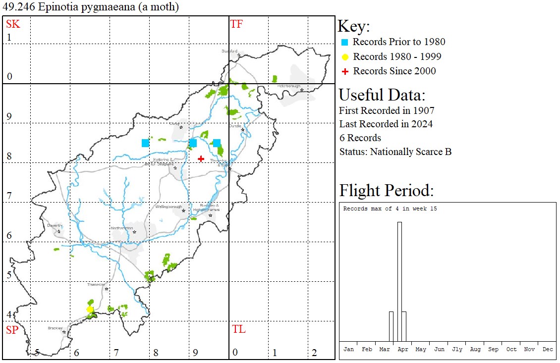as there are very few records at light. This species has been noted to be attracted to the EMP pheromone lure on The Continent and a single adult was apparently assembled to the lure in a Spruce plantation near Kettering in 2021 to support that finding. It may be worth trying this lure, and maybe others (e.g. FUN, MOL, SKI, etc) in suitable habitat to see if the moth is actually more widespread that thought. Further records might also be obtained
