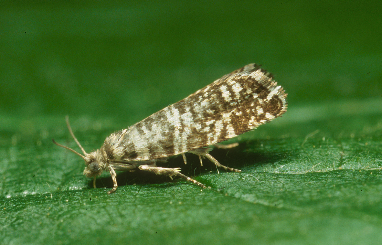 web in a leaf tangle. Adults fly on sunny afternoons and come to light.
