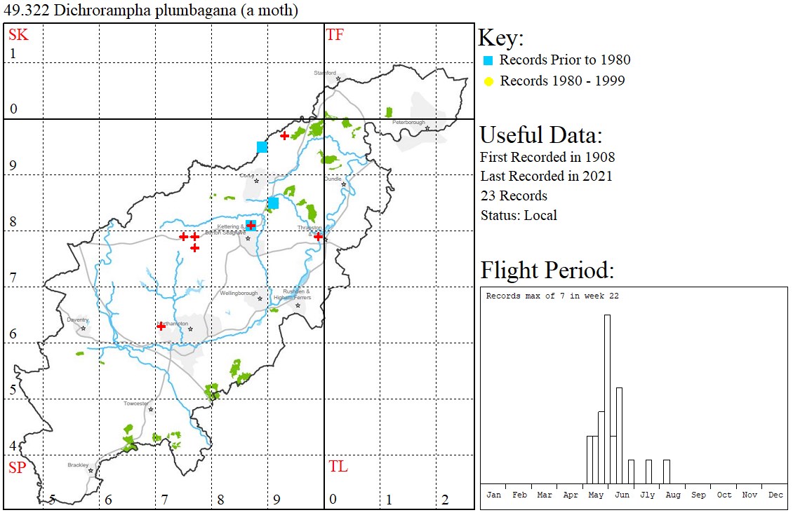 around the foodplant, but will come to light. Older records (prior to 2025) have been called into question due to a possible mix-up between this species and D. obscuratana - which has recently been discovered as an over-looked resident in the UK. Confusion arose due to incorrect dissection images being available for D. plumbagana (which actually depicted D. obscuratana). NB: D. obscuratana feeds on Tansy.
