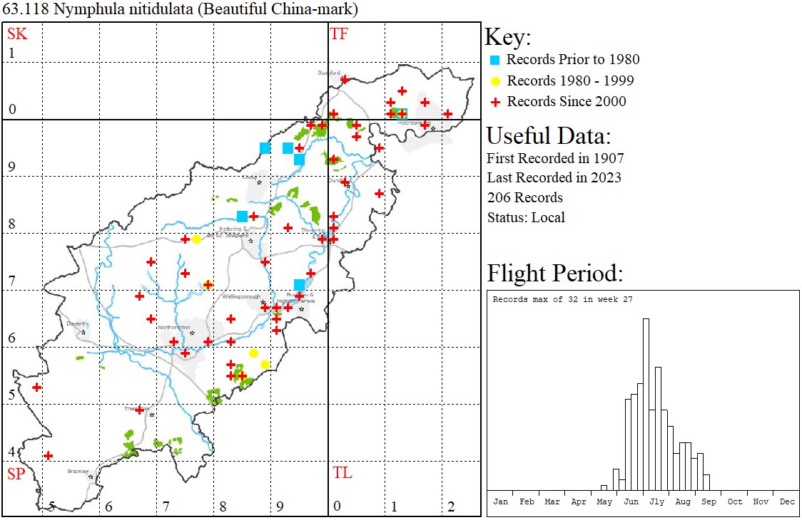 aquatic larvae feed on Bur-weed. Adults sometimes seen in flight in
