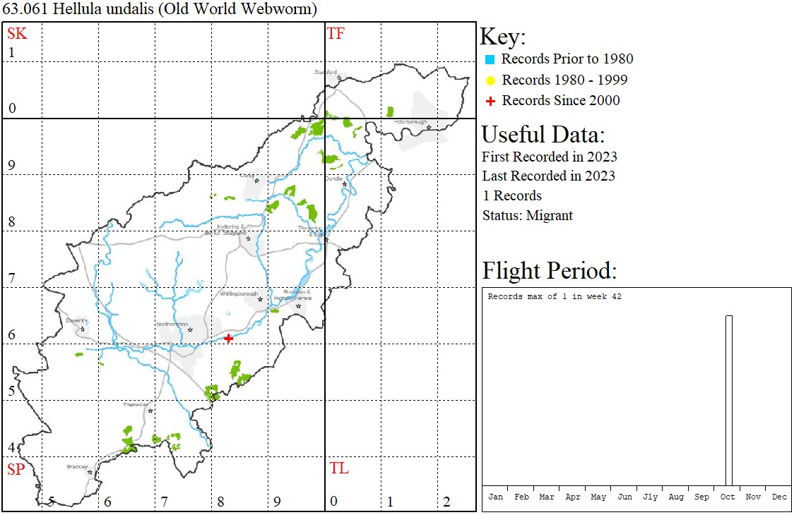 first VC32 record was of a single adult to light in a Cogenhoe garden (SP86). This followed a period of significant migration, with many examples of this species being recorded in mostly coastal locations in the south-west of the UK. The species is widespread in Asia and Africa, but increasingly found in southern Europe.