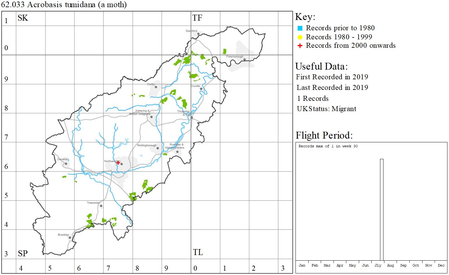 Care needed to separate from congeners e.g. Acrobasis repandana especially in worn individuals, but the raised scales are the determining feature