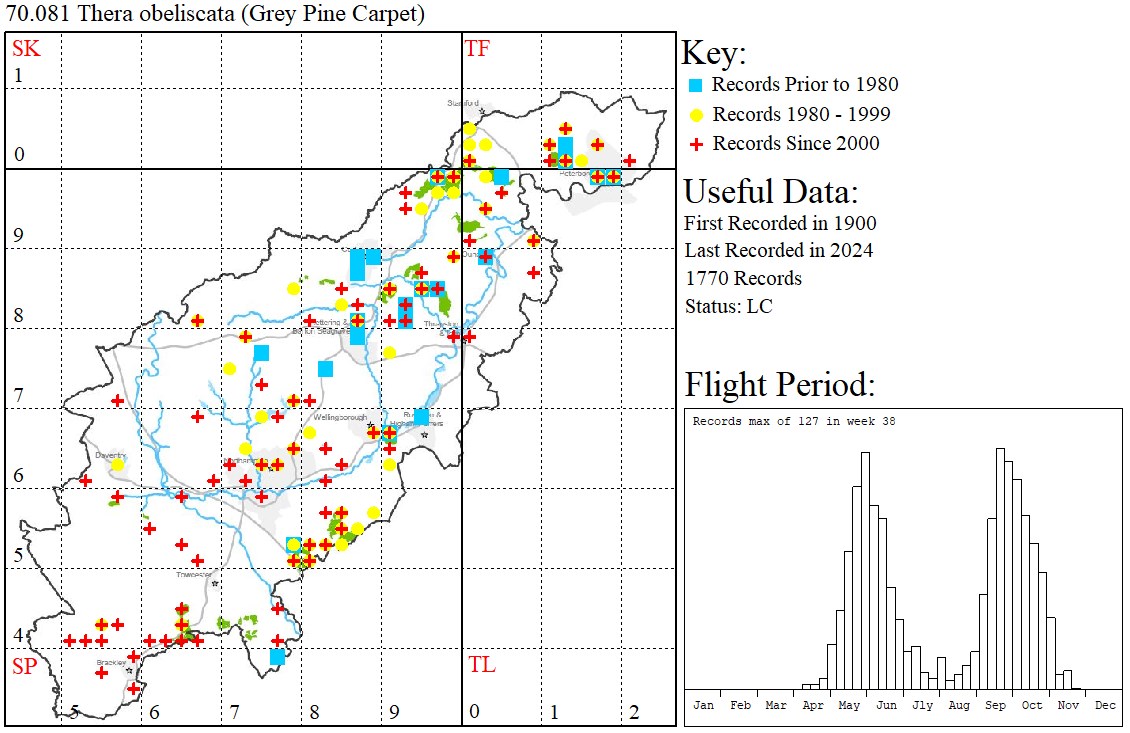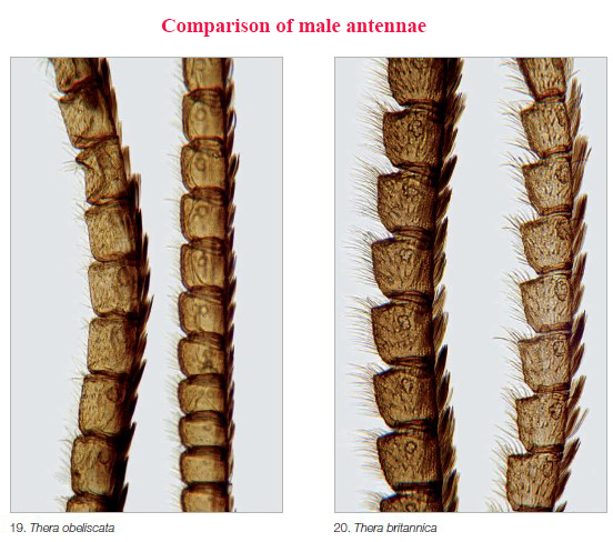 was from 9 May to 6 November. Difficult to separate from Spruce Carpet. Compared to Spruce Carpet it is usually light red-brown to dark brown rather than grey and is more lightly fluted narrowing dorsally, however, this can vary considerably. Most reliable feature is to examine the male antennae under a good lens.