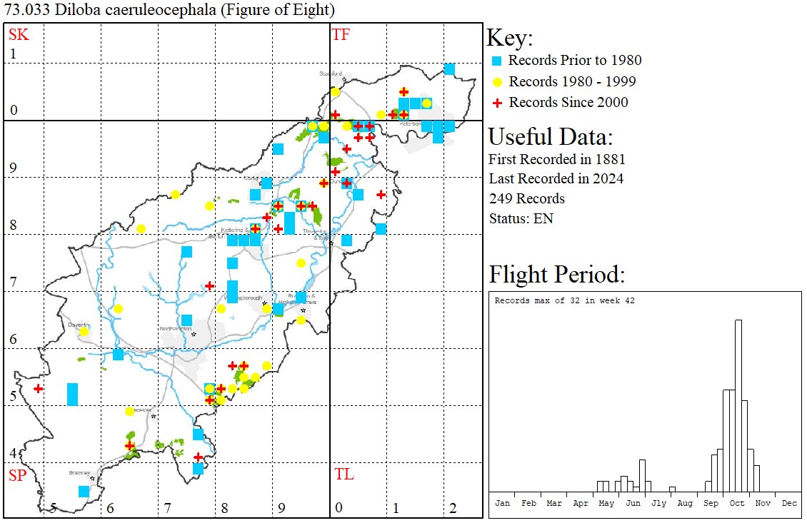Observations: Since the turn of the Millenium, this species has apparently shown a fairly significant decline in VC32, and now tends to be recorded only in the North-east of the county. NB: John Ward writes previously: Although