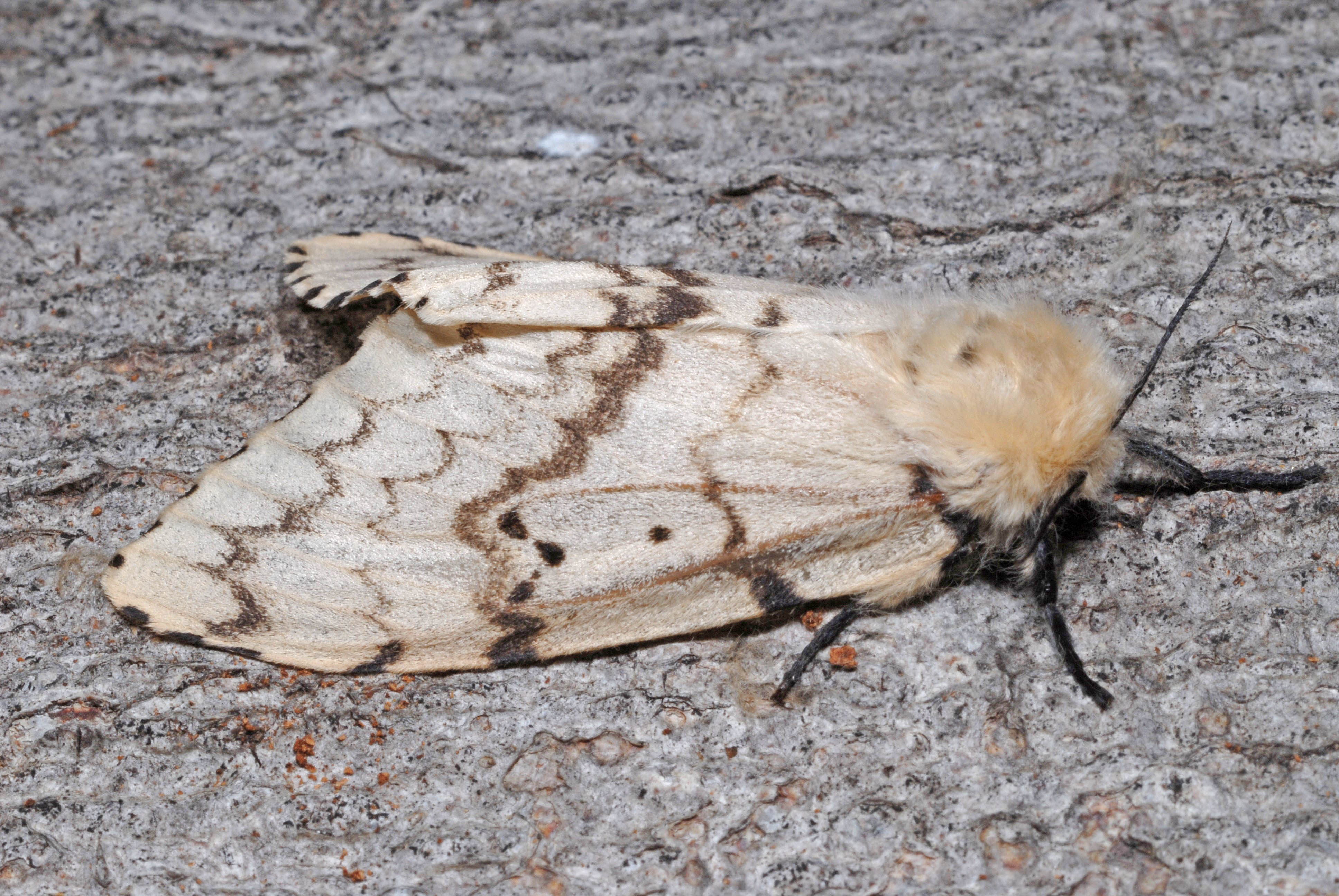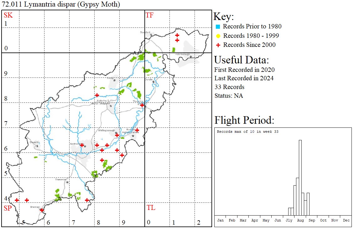 Observations: Former resident (possibly a sub-species established in the Fens of Hunts, Cams & Norfolk) which became extinct in the UK. Male moths recently appeared in low numbers as presumed migrants from The Continent but appears to have since become resident in southern parts of the UK. Six larvae of this species were found on Birch in Thrapston in 2020, reared to adulthood, but retained and not released. Further males were recorded later in 2020 during a period of "good migrant weather" in Higham Ferrers and Brackley - the catch at Higham Ferrers including an Oak Processionary, again suggesting possible dispersal/migration. The larger, paler female is a very poor flier and often not encountered.