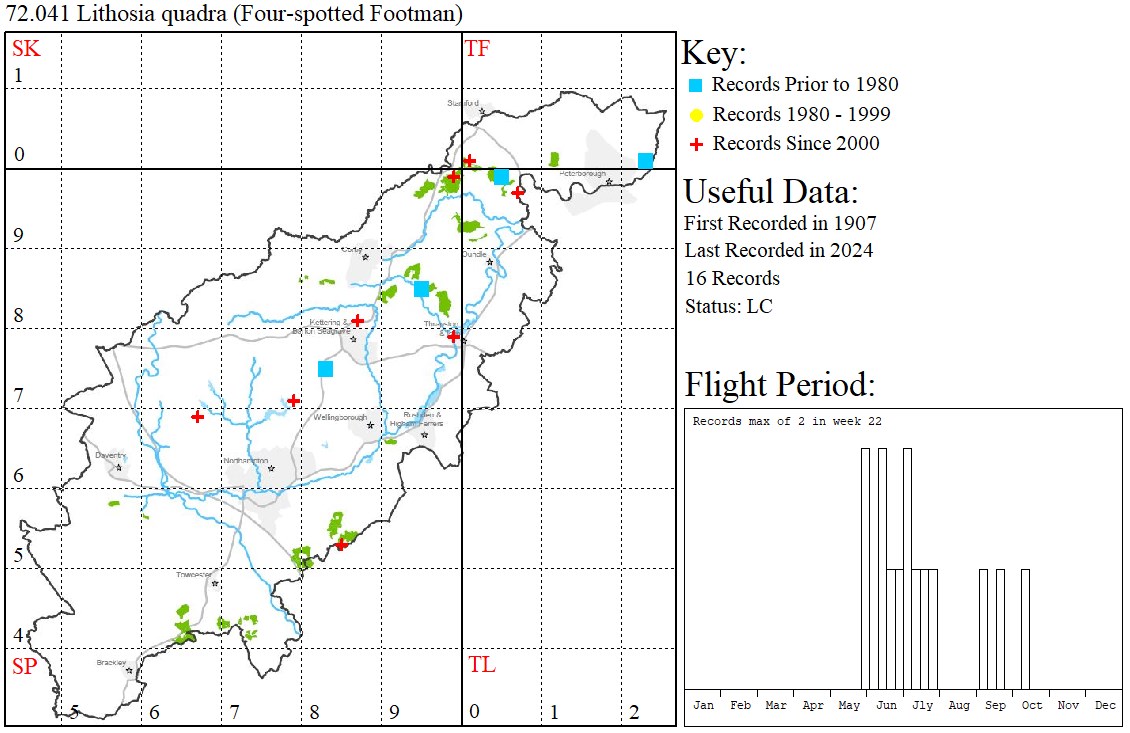 Observations: Occurs sporadically in VC32 and assumed to be a migrant, with very few repeat site records. Usually males recorded to light. The tally for Northants appears to be comparable with other midland counties.