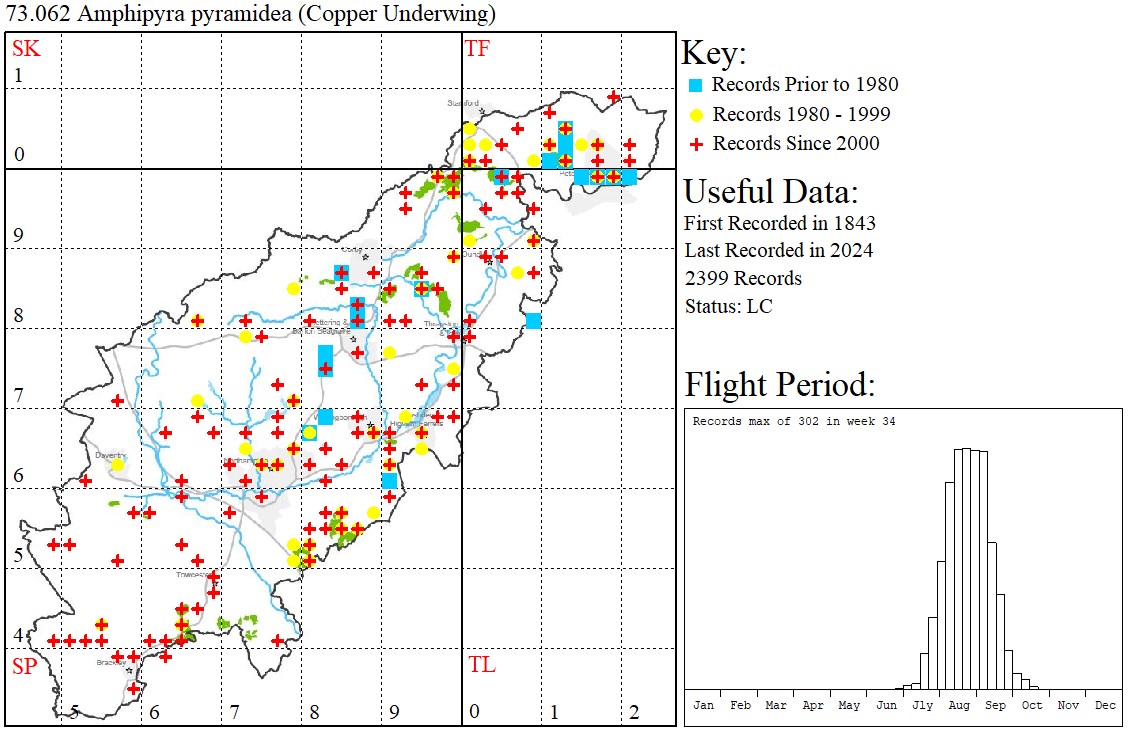 B&F: 2297 ABH: 73.062 Status: Resident. Distribution and Abundance: Common. Primary Habitat: Woodland. Flight Period: Single brooded from August to October. Observations: : In my experience the moth is usually more numerous at sugar than at light. It was plentiful at sugar on 9 September 1993 at Ashton Wold with some twenty examples being attracted, whereas m.v. light traps left overnight on the same visit were much less successful in only catching four moths. In the past I have found the caterpillar on the underside of leaves of small sallows growing along the sides of woodland rides. The species is similar in appearance to its congener Svenssons Copper Underwing (Amphipyra berbera). There have been many tips documented for use to differentiate the two Copper Underwing