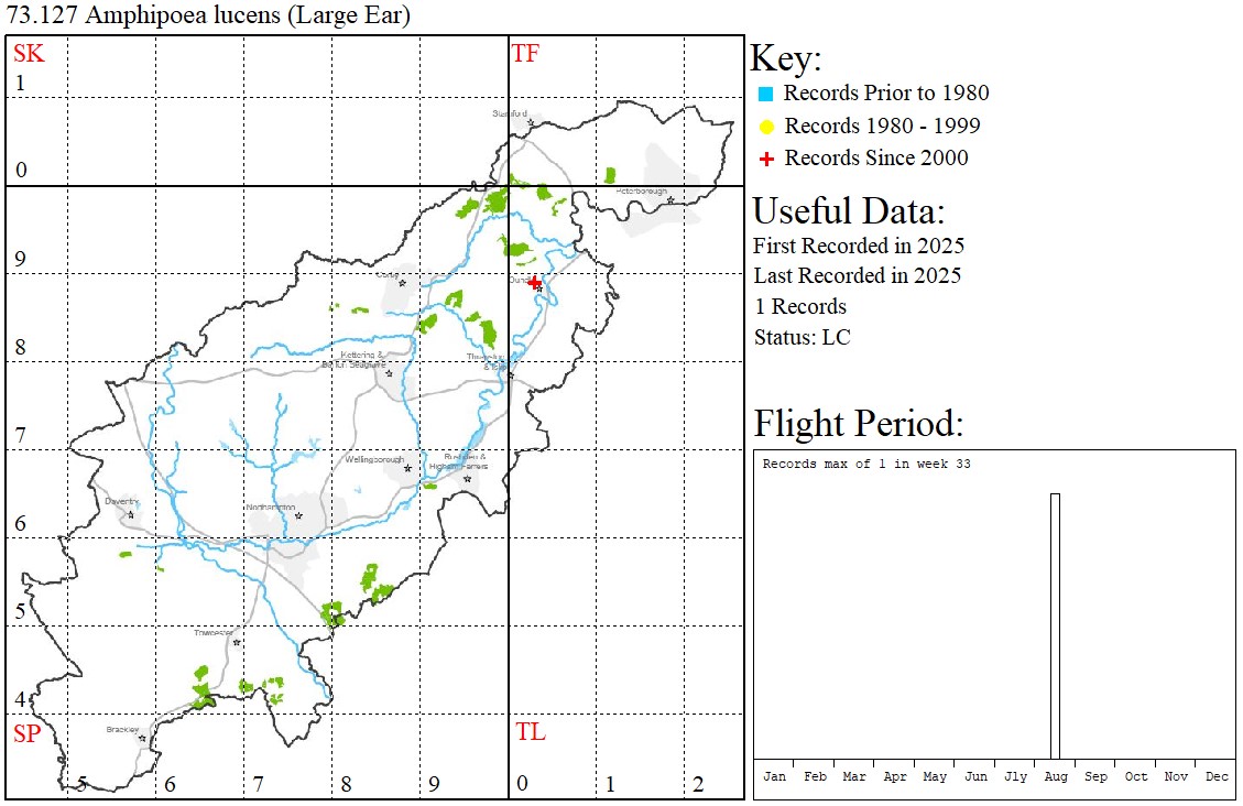 Observations: The species is noted to be occur on moorland and acid grassland, where the larvae feed on the roots and stem bases of grasses, especially Purple Moor-grass (Molinea caerulea). A single Large Ear was noted in neighbouring Leicestershire in 2024 and thus the alert was made to keep an eye out for Ear Moth species. A single "Ear Moth" specimen was recorded in a garden light trap in Oundle (TL09) on 13.viii.2025. It was retained as "it looked different", and when presented for dissection at year-end its identity was discovered. Given the normal habitat for this species, this moth likely reprsents a migrant or adventive individual.