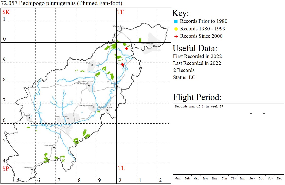 Observations: A single moth was attracted top a garden light trap in Oundle on 14th September 2022. It is possible that this was as a result of dispersal/migration as the record occured during a period of significant migration activity, along the lines of those witnessed in 2006.