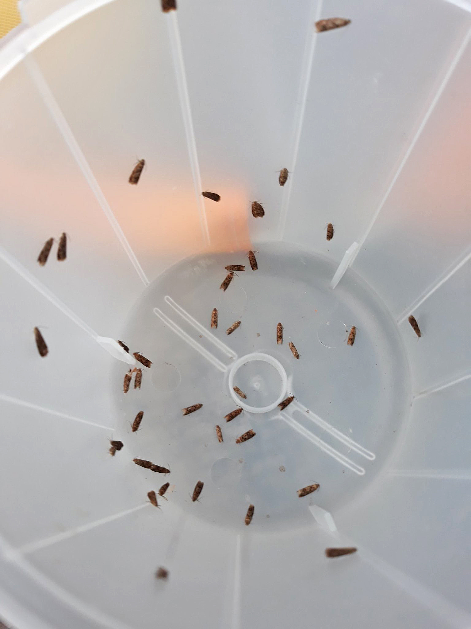 An amazing 51 Grapholita lobarzewskii were recorded in a pheromone lure trap, left overnigth, at the Harlestone Rd allotments in Northampton (SP76). The photo below shows the inside of the trap in the morning with just some of the remaining males in situ. If you have the "SKI" lure, then it is worth targeting mature apple trees and orchards.